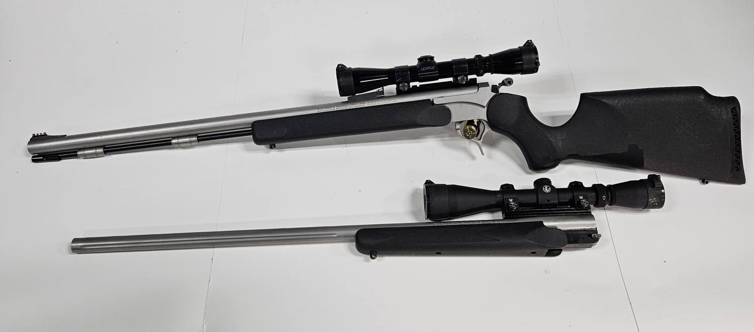 THOMPSON CENTER .50 BLACK POWDER WITH A LEUPOLD SCOPE AND 30-06 SPRINGFIELD BARREL WITH A VORTEX SCOPE.